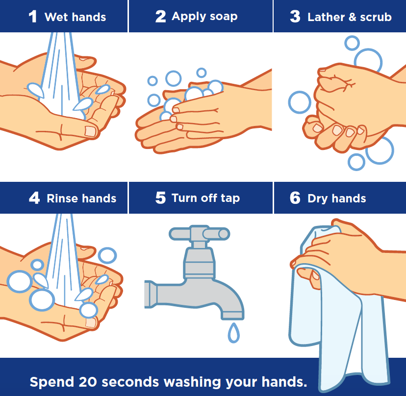 - 經常用肥皂與清水洗手,持續20秒,並用紙巾擦拭乾燥或使用烘手機